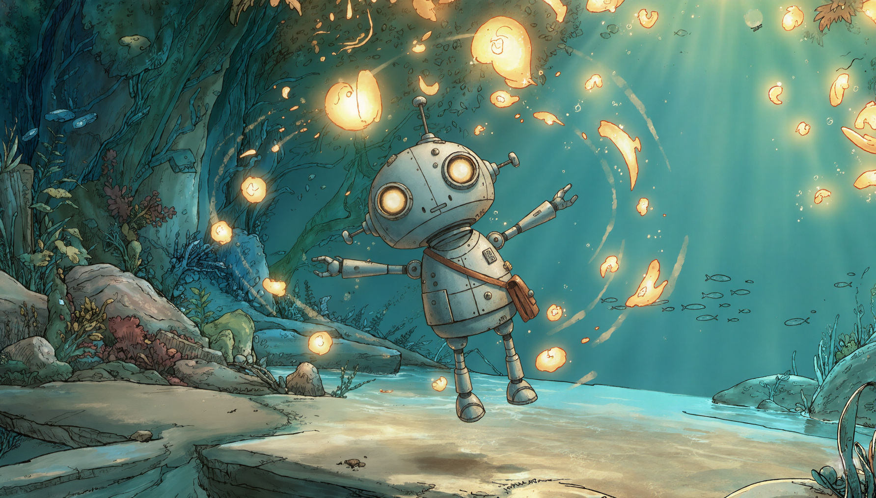 Tiny lights dance around Lumo when the world becomes quiet.The plankton shimmer like floating fireflies, curious and playful.