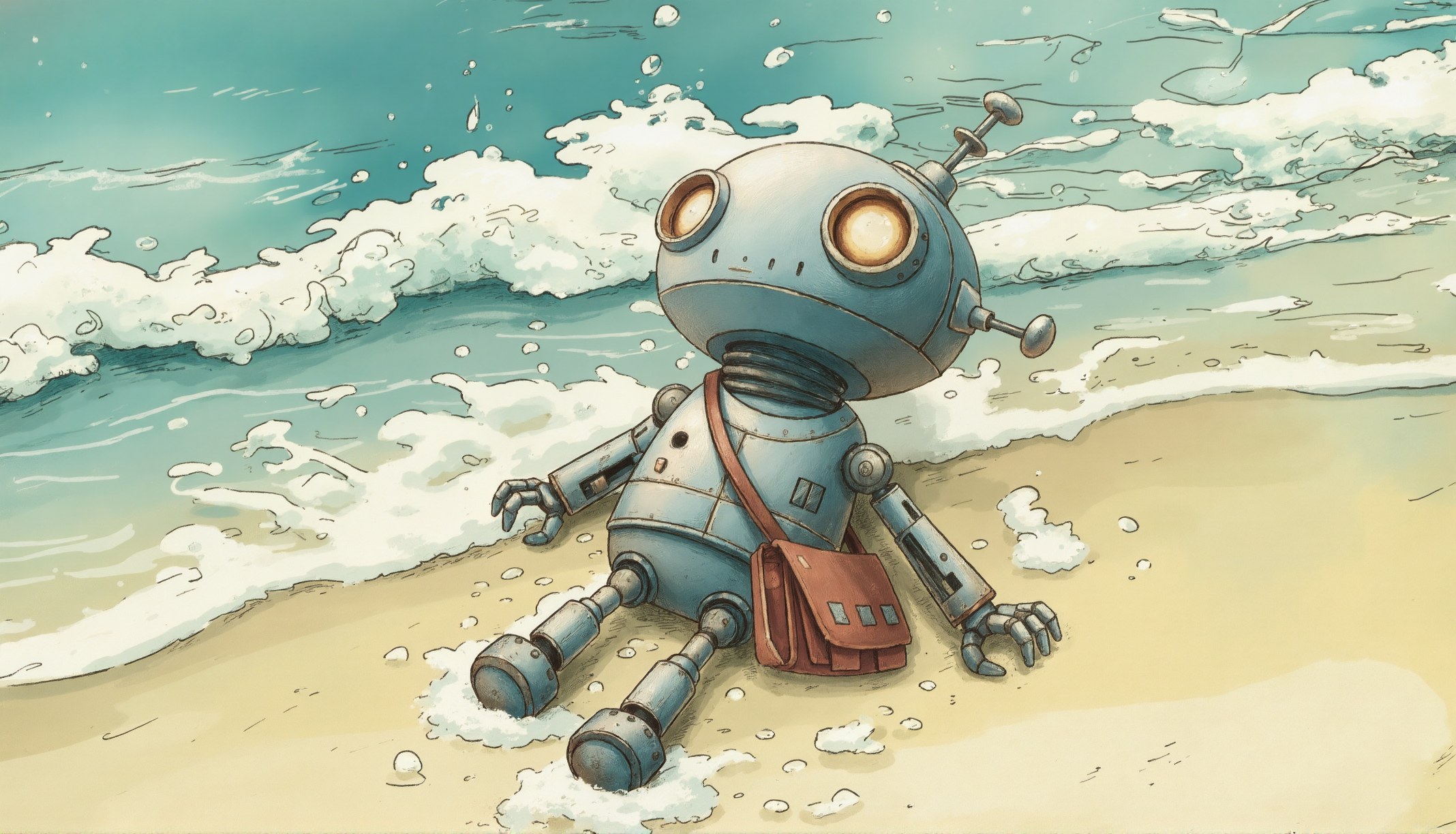 On a quiet shore beneath a pale sky, a little robot rises—alone, unsure, yet strangely hopeful.